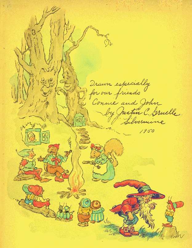A copy of the first edition of Once Round the Sun was found accidentially in a used bookstore in the mid 1980's by a friend of the book's author. Inside the front cover were handpainted color illustrations by Justin Gruelle with an inscription to his friends John and Connie Hasbrook. The artist and the recipients are no longer living.These additional illustrations together with the inscription are reproduced below.